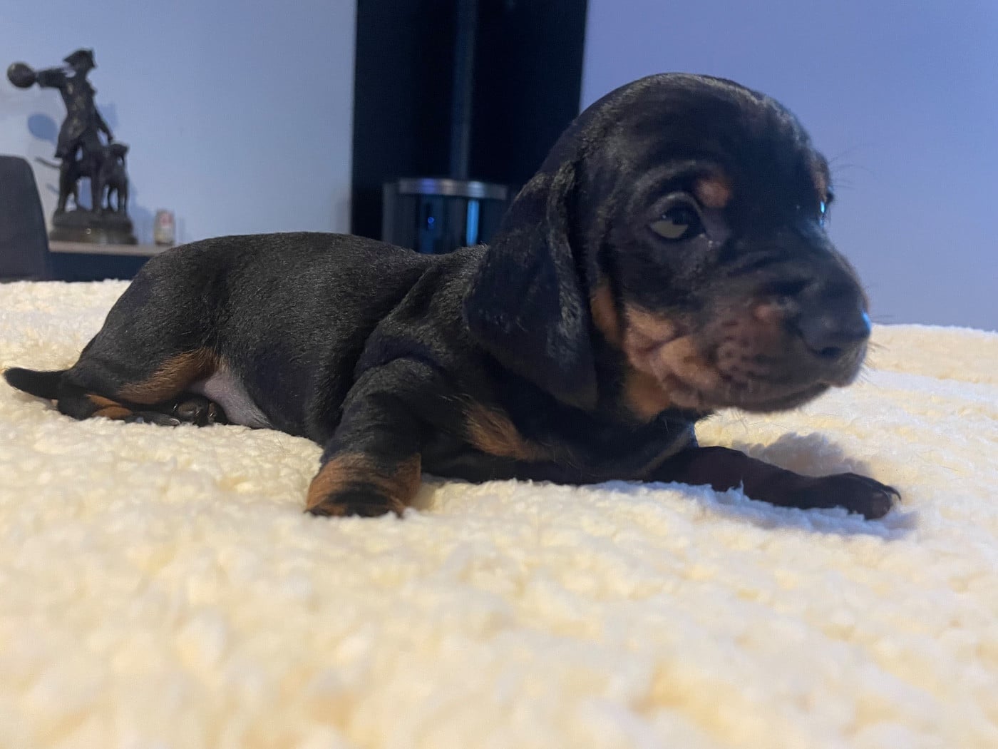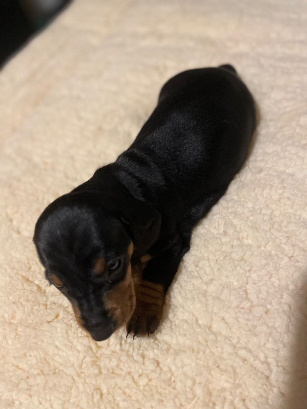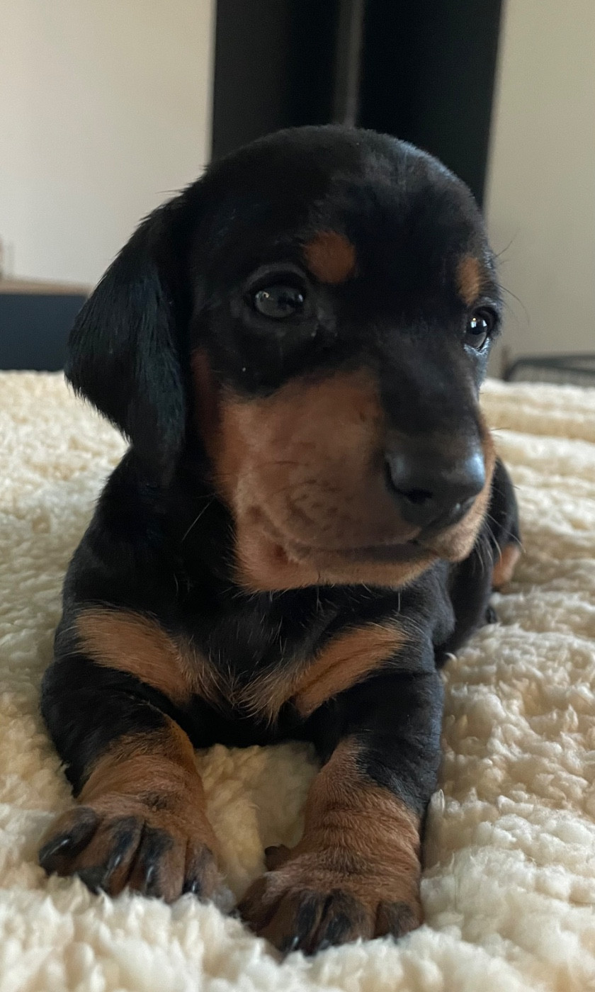 Chiot standard poil ras, noir et feu Petit tâche blanche dans le cou Réservé par Mme Maureen 250g a la naissance 480g a 1 semaine 1700g a 1 mois