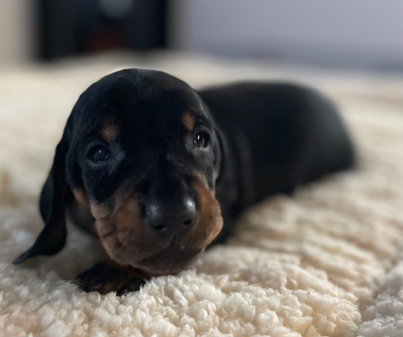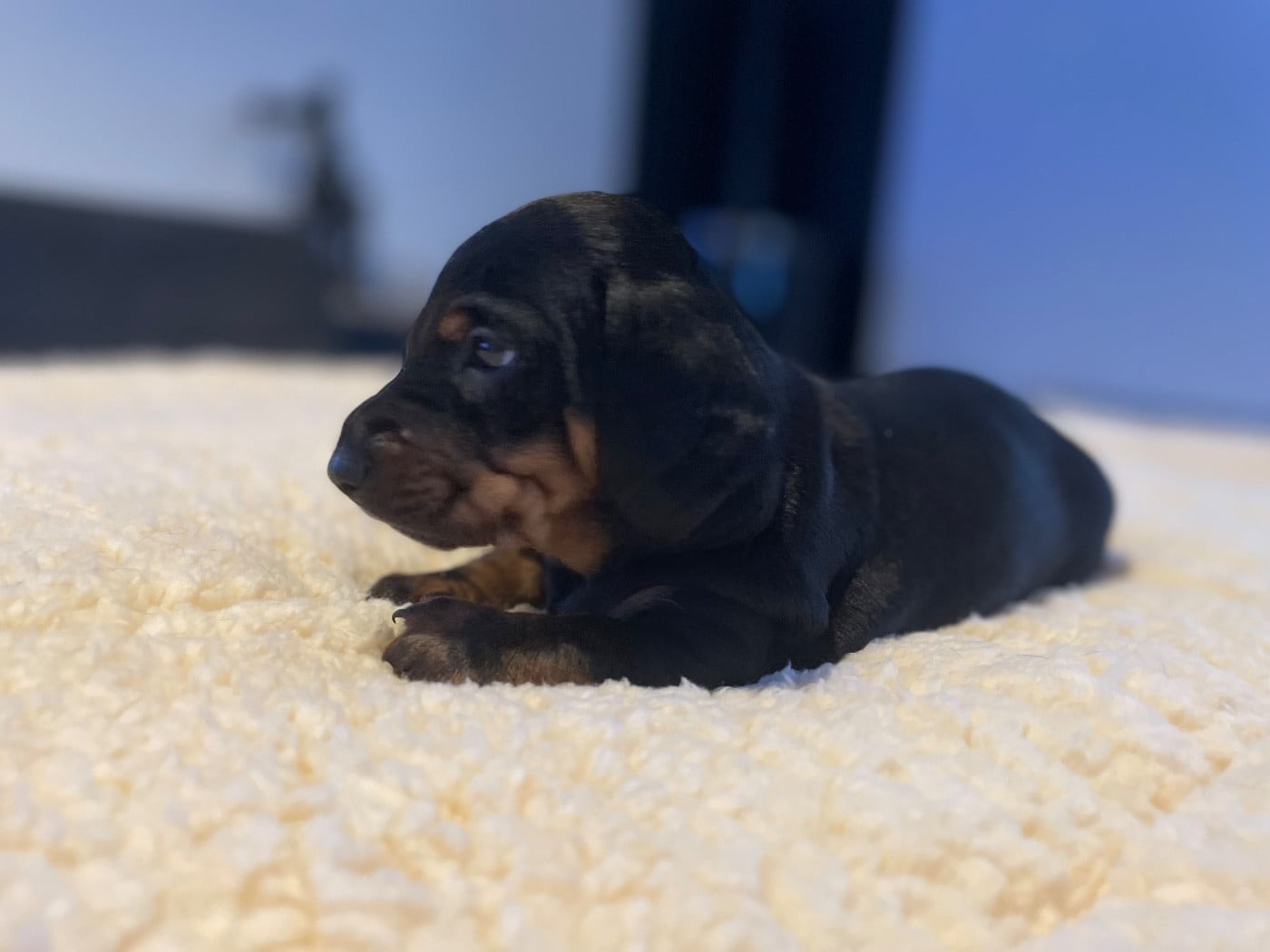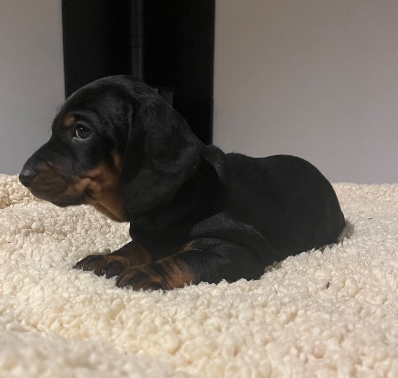 Chiot standard poil ras, noir et feu Petit tâche blanche dans le cou Réservé par Mme Maureen 250g a la naissance 480g a 1 semaine 1700g a 1 mois