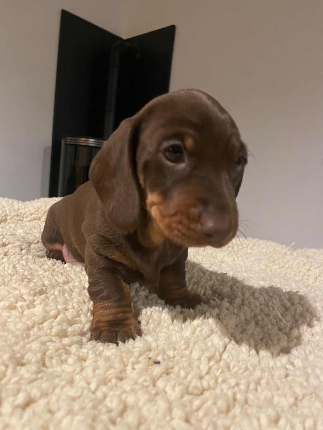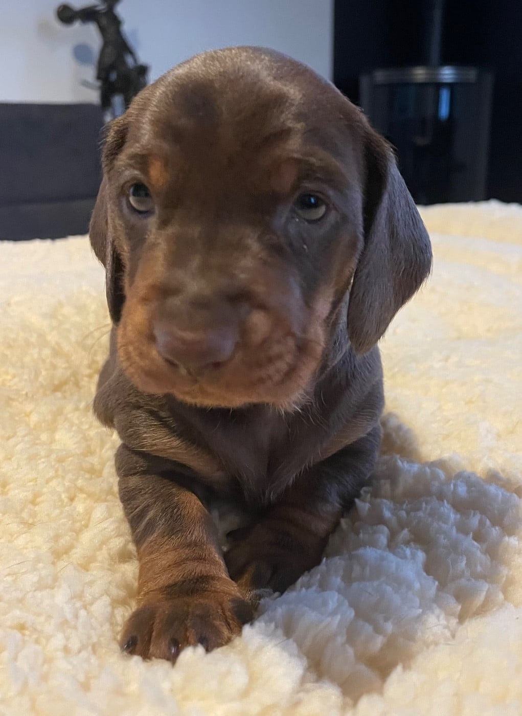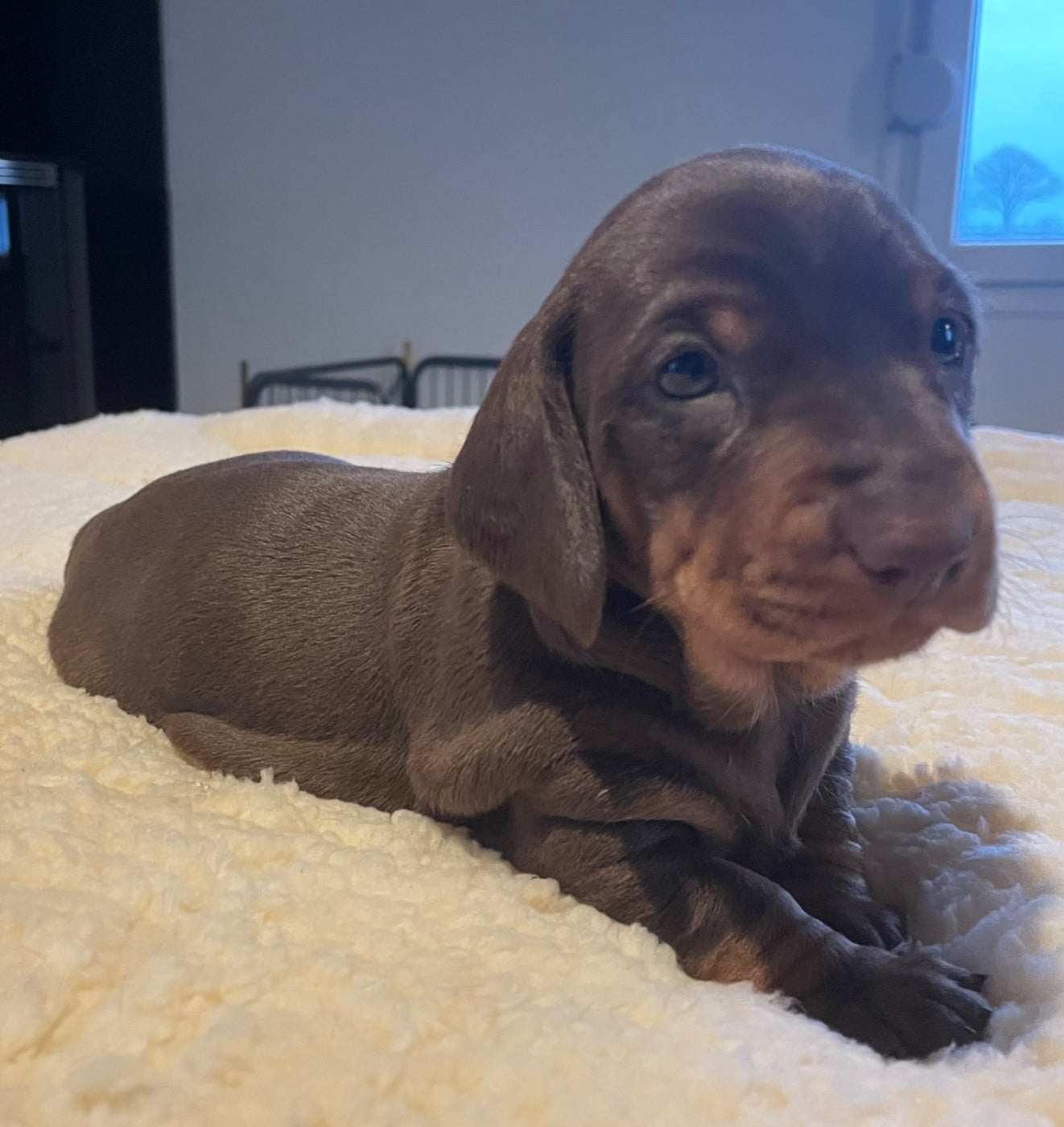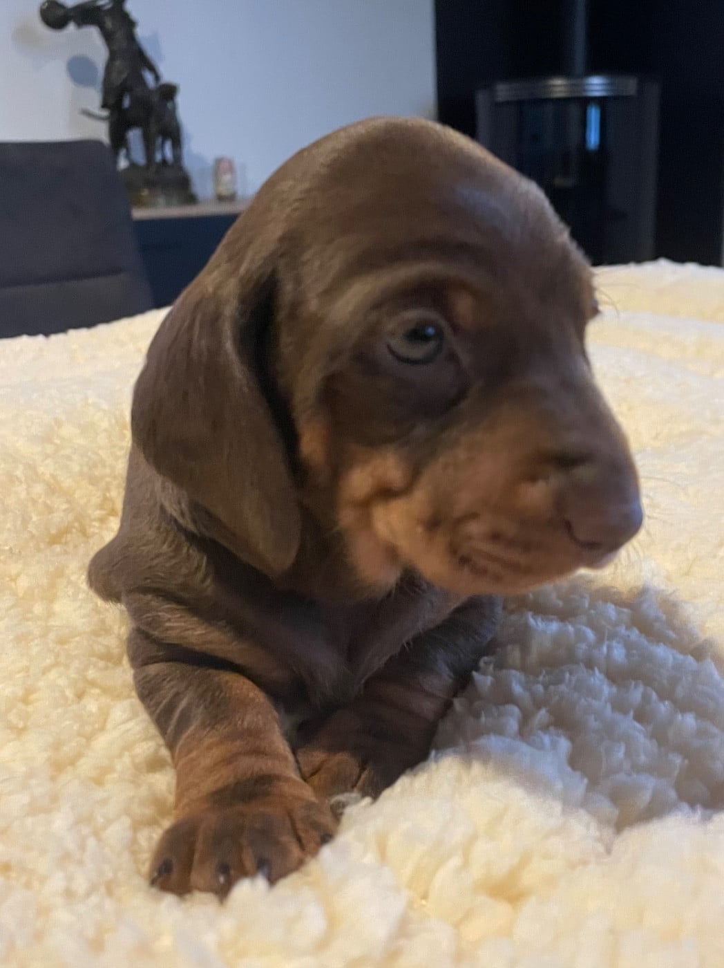 Chiot fauve et feu, standard poil ras Aura probablement la couleur du papa. Poid de naissance 300g 550g a 1 semaine 910g a 2 semaines, 1er vermifuge 1680g à 4 semaines Réservée Mme Nathalie F